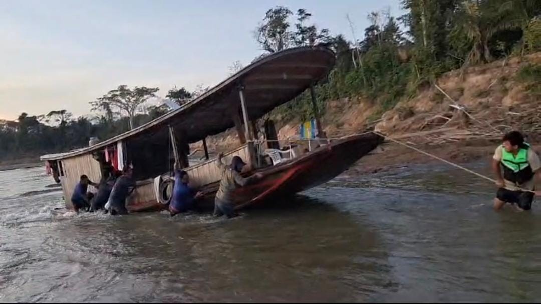 Com o verão amazônico, o nível do rio está muito baixo e dificulta a navegação. Com a formação de bancos de areia, as equipes precisaram puxar os barcos que ficaram encalhados no manancial.