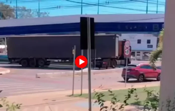 O motorista tentou acessar a via por baixo do viaduto, mas a altura do veículo ultrapassava o limite permitido para passagem. O impacto danificou uma placa de sinalização e deixou o tráfego parcialmente bloqueado.