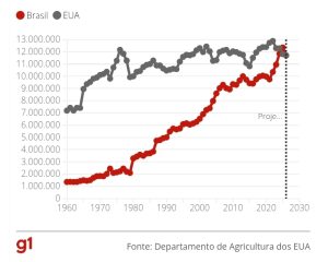 É a primeira vez que o Brasil ocupa esse posto nas estatísticas do USDA, que começaram na década de 1960 e sempre tiveram os EUA na liderança.