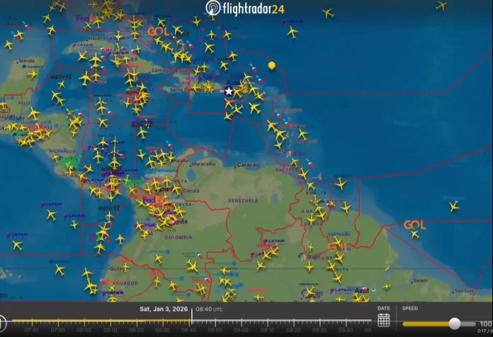 O site de rastreio de voos FlightRadar24 mostrou o espaço aéreo vazio sobre a Venezuela durante a operação de captura do ditador Nicolás Maduro coordenada pelos Estados Unidos, de acordo com um oficial americano.