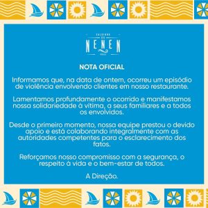 O restaurante Caldinho do Nenen Porto, estabelecimento onde o crime foi registrado, divulgou nota nas redes sociais sobre o ocorrido, lamentando o caso e informando que colabora com as investigações.