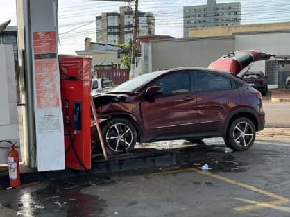 Duas mulheres ficaram feridas. Um carro modelo HR-V invadiu um posto de gasolina e bateu violentamente contra uma bomba de abastecimento.